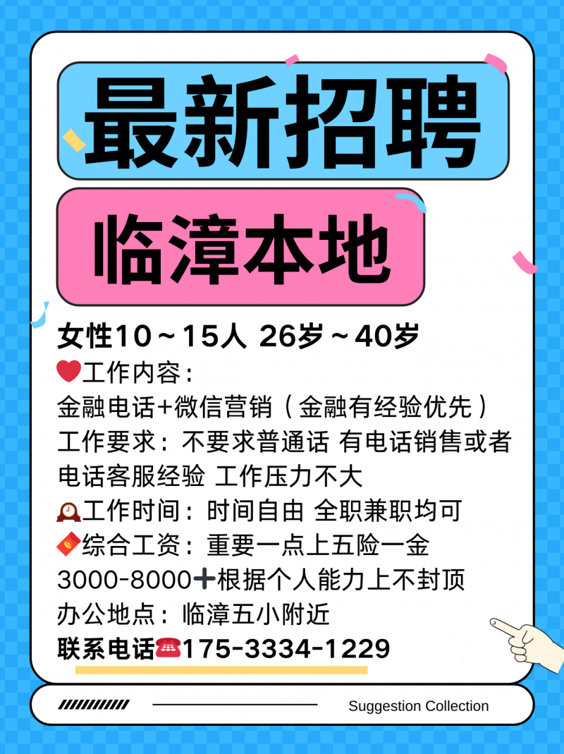 招聘 临漳本地(女性10~15人,26岁~40岁) ❤️工作内容: 金融电话+微信营销(金融有经验优先) 工作要求:不要求普通话,有电话销售或者电话客服经验,工作压力不大 ️工作时间:时间自由,全职兼职均可 综合工资:重要一点上五险一金,3000-8000➕根据个人能力上不封顶。 办公地点:临漳五小附近